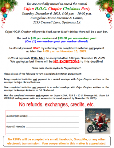 You are cordially invited to the annual Cajun HOG Christmas Party Saturday, December 6, 2025, 6:00 pm-10:00 pm at Evangeline Downs Racetrac & Casino, 2235 Creswell Lane, Opelousas, LA. $10 per member, $30 per non-member guest -1 guest per member allowed. RSVP by returning the completed invitation and payment no later than 4:00 pm on November 15, 2025. We apologize but NO EXCEPTIONS to the deadline. Please bring completed invitation and payment in a sealed envelope with Cajun Chapter on envelope to Monique Melancon or Pat Newbound or to Cajun Harley-Davidson.