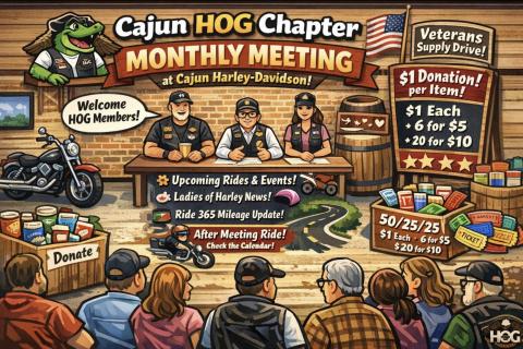 Come join the Cajun HOG Chapter for the monthly chapter meeting.  After signing in, let’s not forget about donating to the Veterans supply drive ($1.00 per ticket or ticket per item donated) as well as tickets for door prizes and 50/25/25 raffle ($1.00 each; 6 tickets for $5.00; 20 tickets for $10.00).
