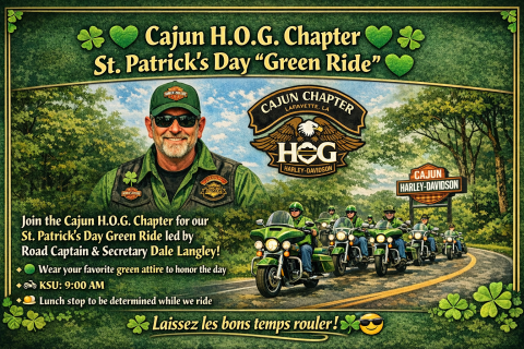 Join the Cajun H.O.G. Chapter for our St. Patrick’s Day Green Ride, led by Road Captain & Secretary Dale Langley!