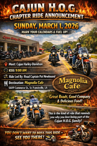 Mark your calendars and fuel up! Join the Cajun H.O.G. Chapter on Sunday, March 1, 2026 for a scenic and fun chapter ride you won’t want to miss.