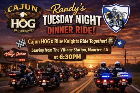 Enjoy an evening of good food and great fellowship with your Cajun HOG and local Blue Knight families. Come with a full tank of gas and leave with a full belly!